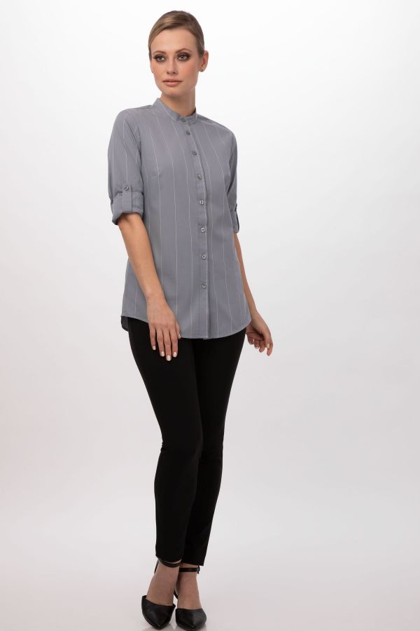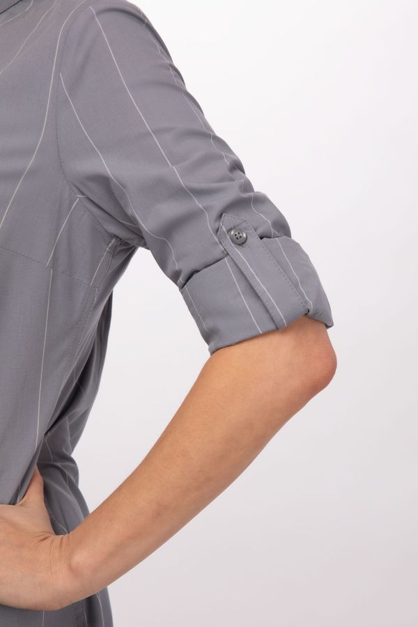 Die geknöpfte und breitgestreifte Voce Bluse ist mit einem Stehkragen, aufrollbaren Ärmel und einem Schürzenhalter am Kragen ausgestattet.